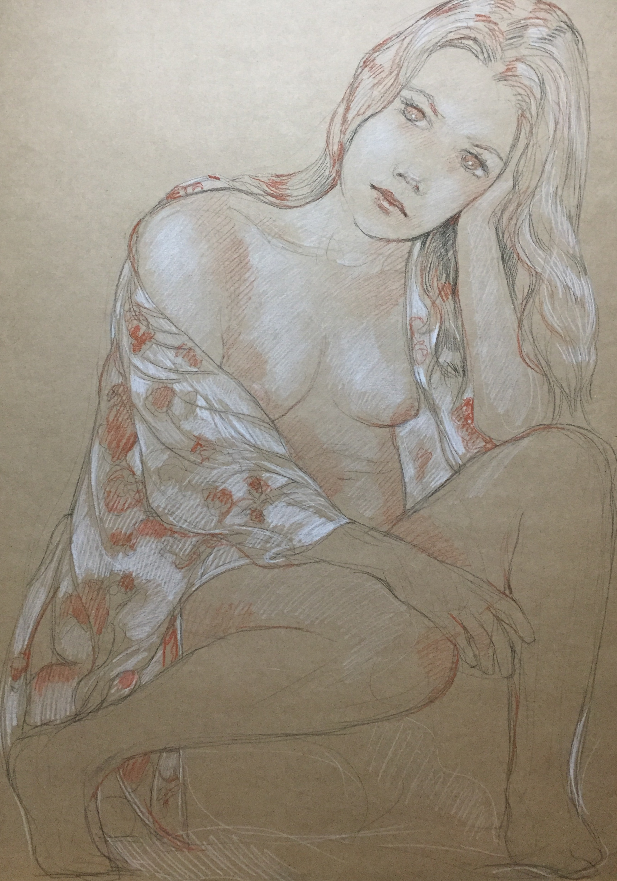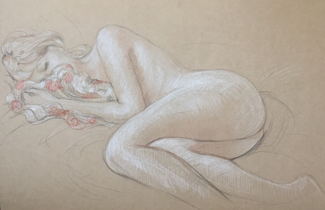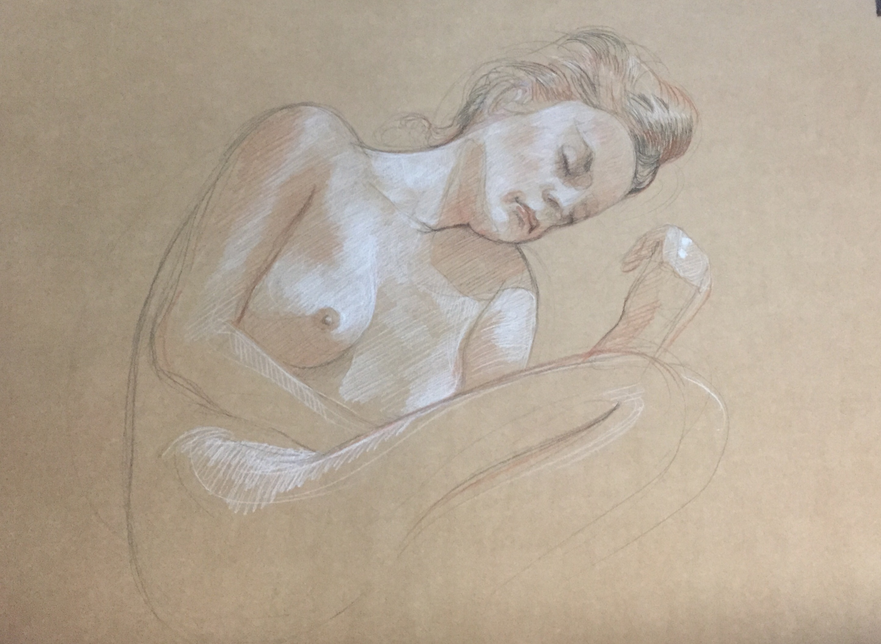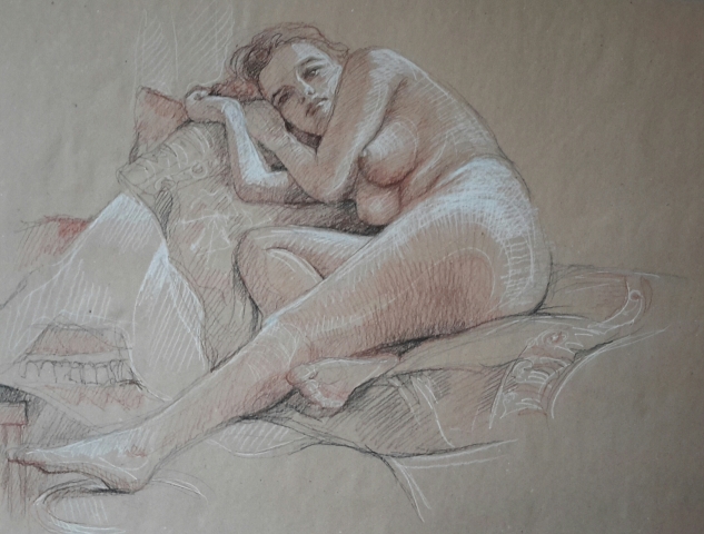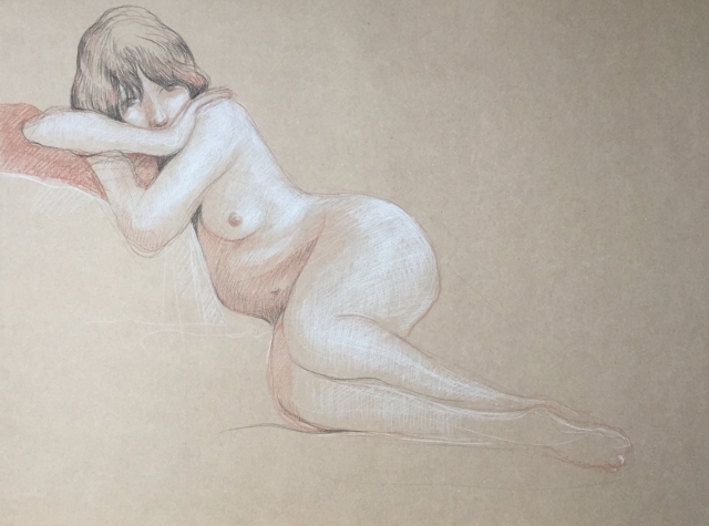 Nu feminin : pierre noire HB, sanguine et crayon blanc,format raisin (50x65cm) et demi raisin, pose 45 min