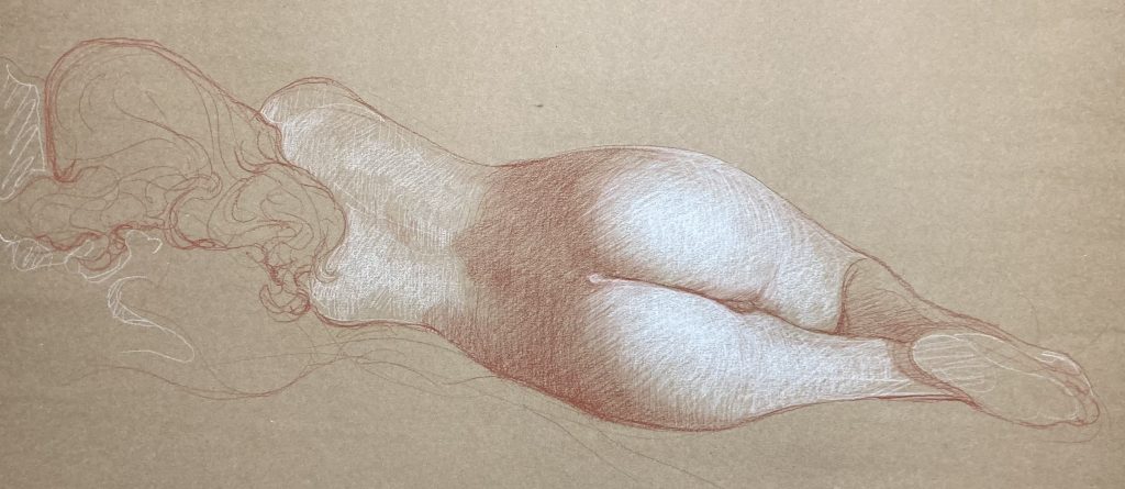 Nu féminin : sanguine, sépia et crayon blanc sur papier.