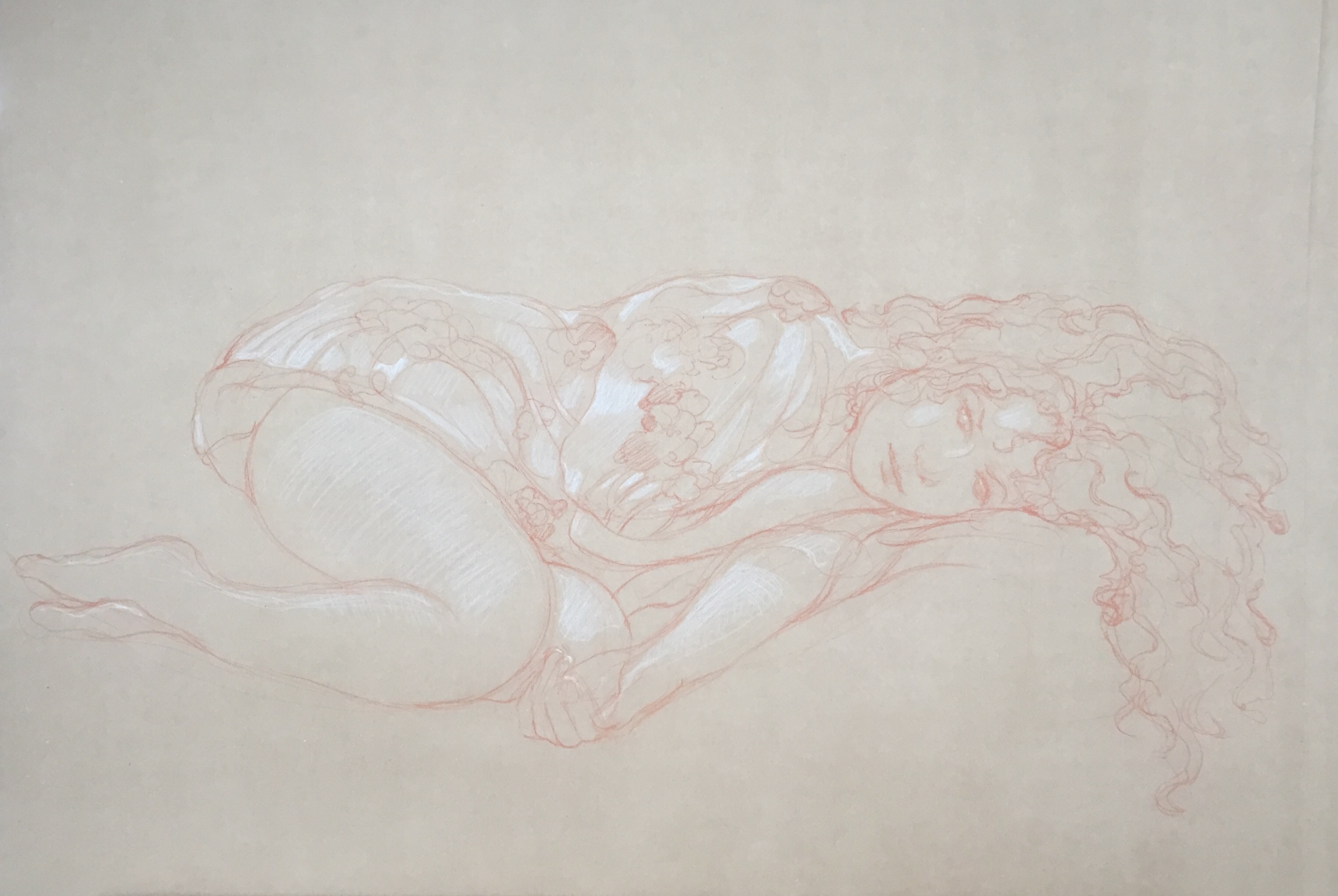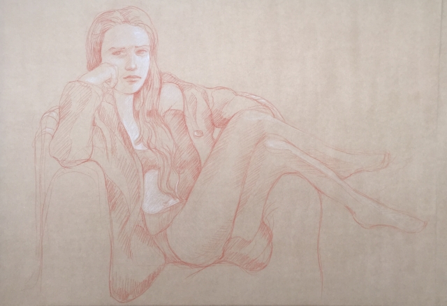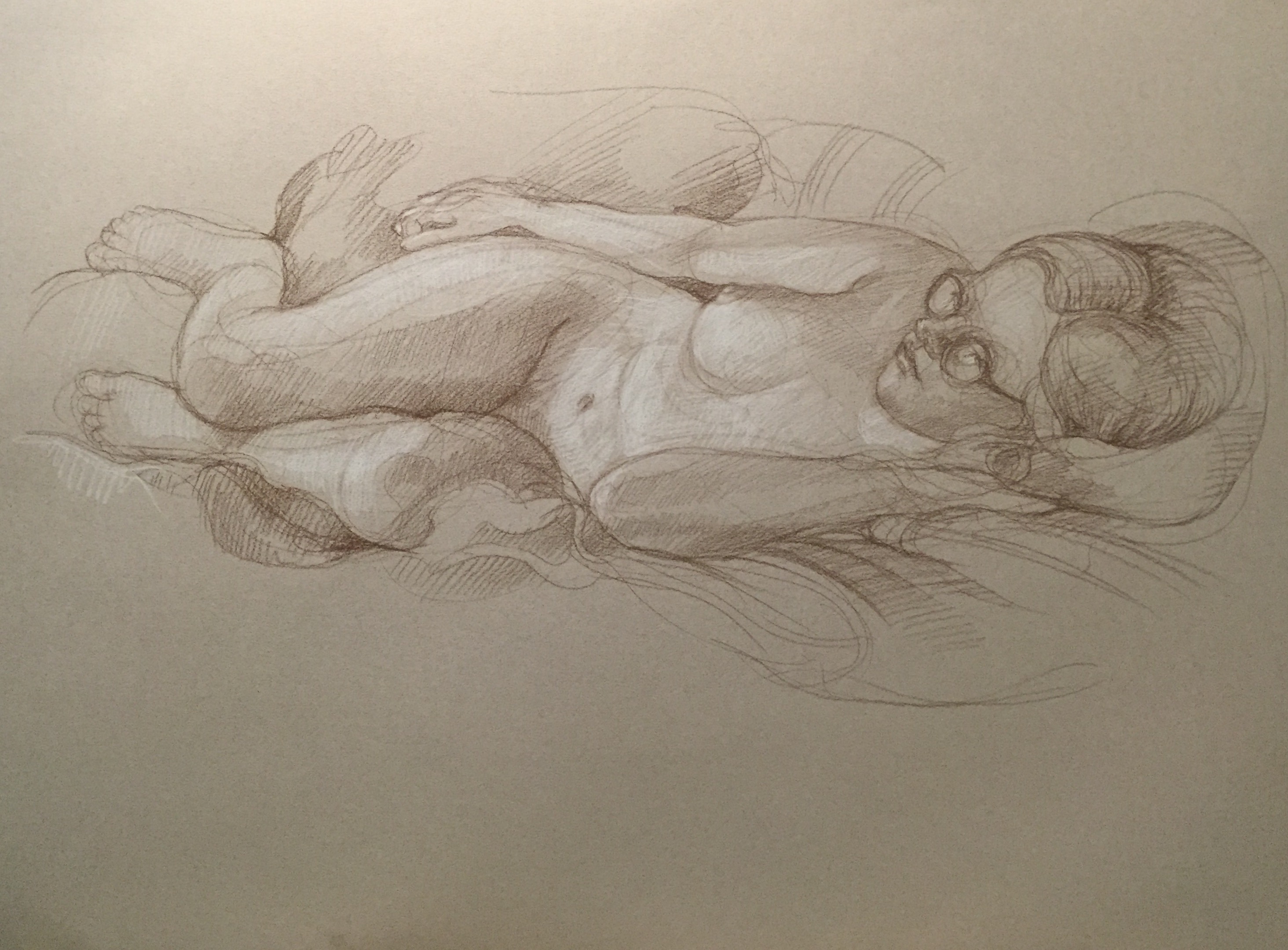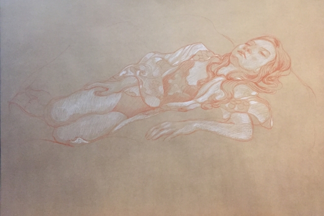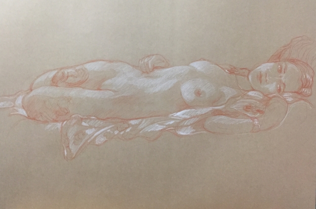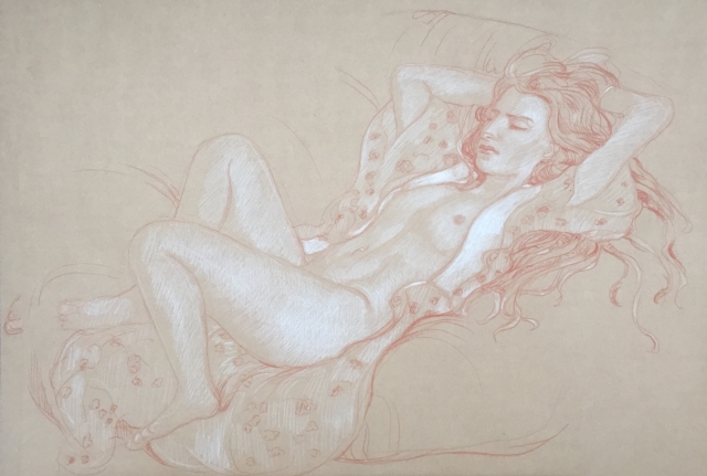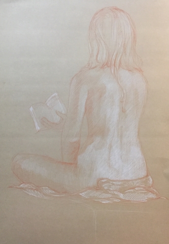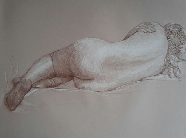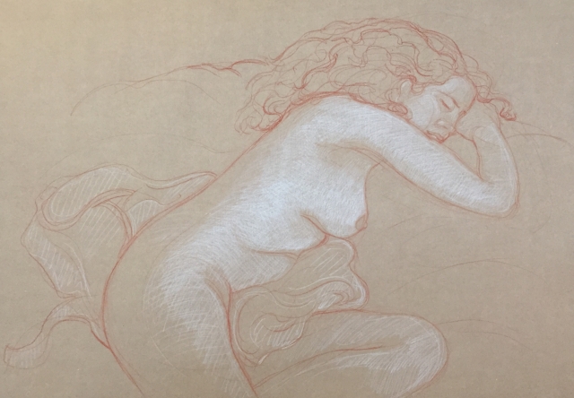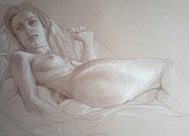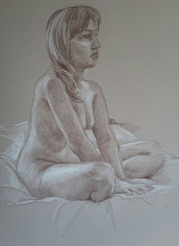 Nu feminin : sépia, sanguine et crayon blanc,format raisin (50x65cm), pose 45 min